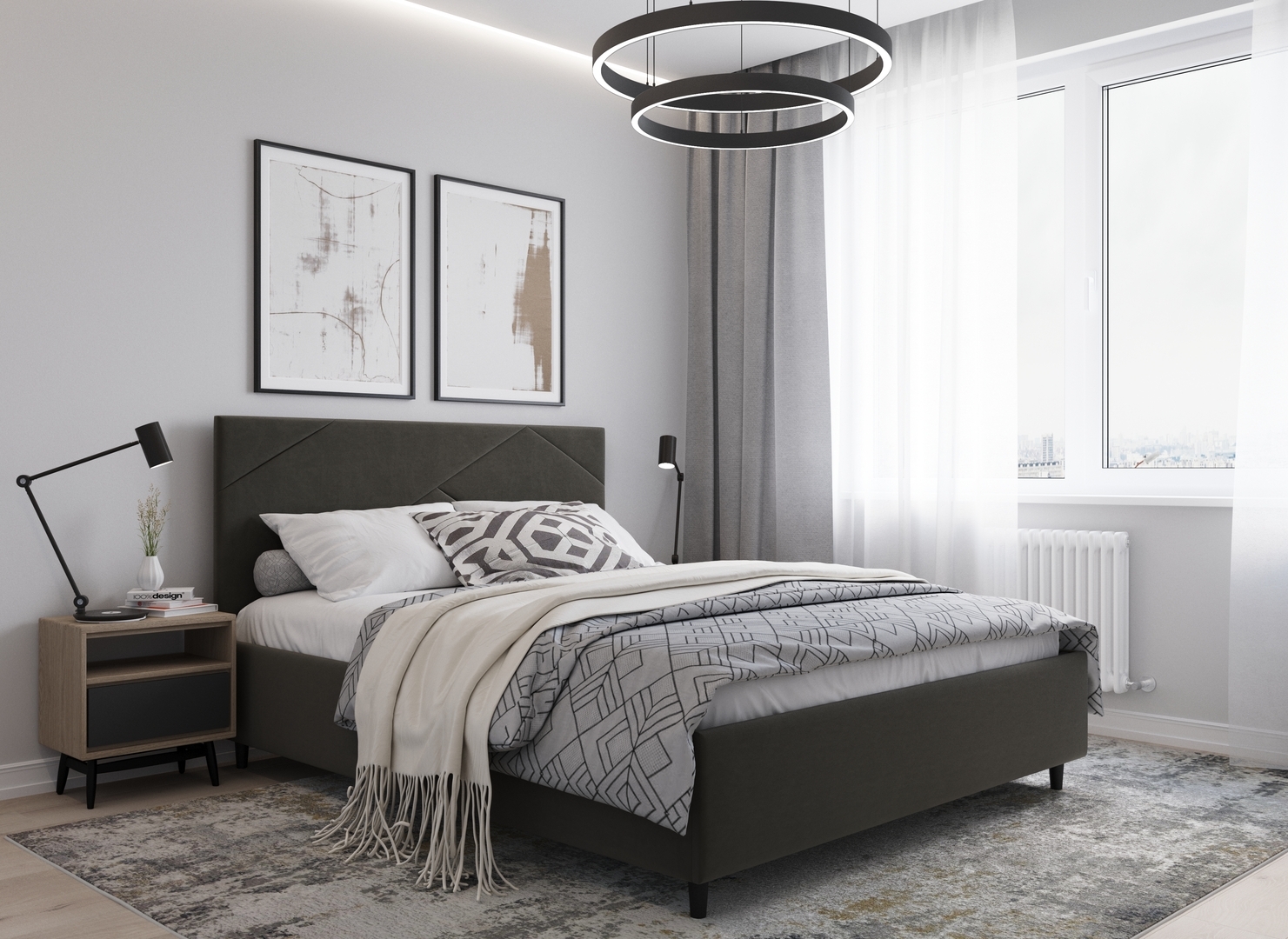 Элегантным и практичным акцентом служат скрытые карманы, расположенные по его углам. Лаконичные формы объемных царг создают единый гармоничный образ и фокусируют внимание на центральном текстурном элементе кровати.